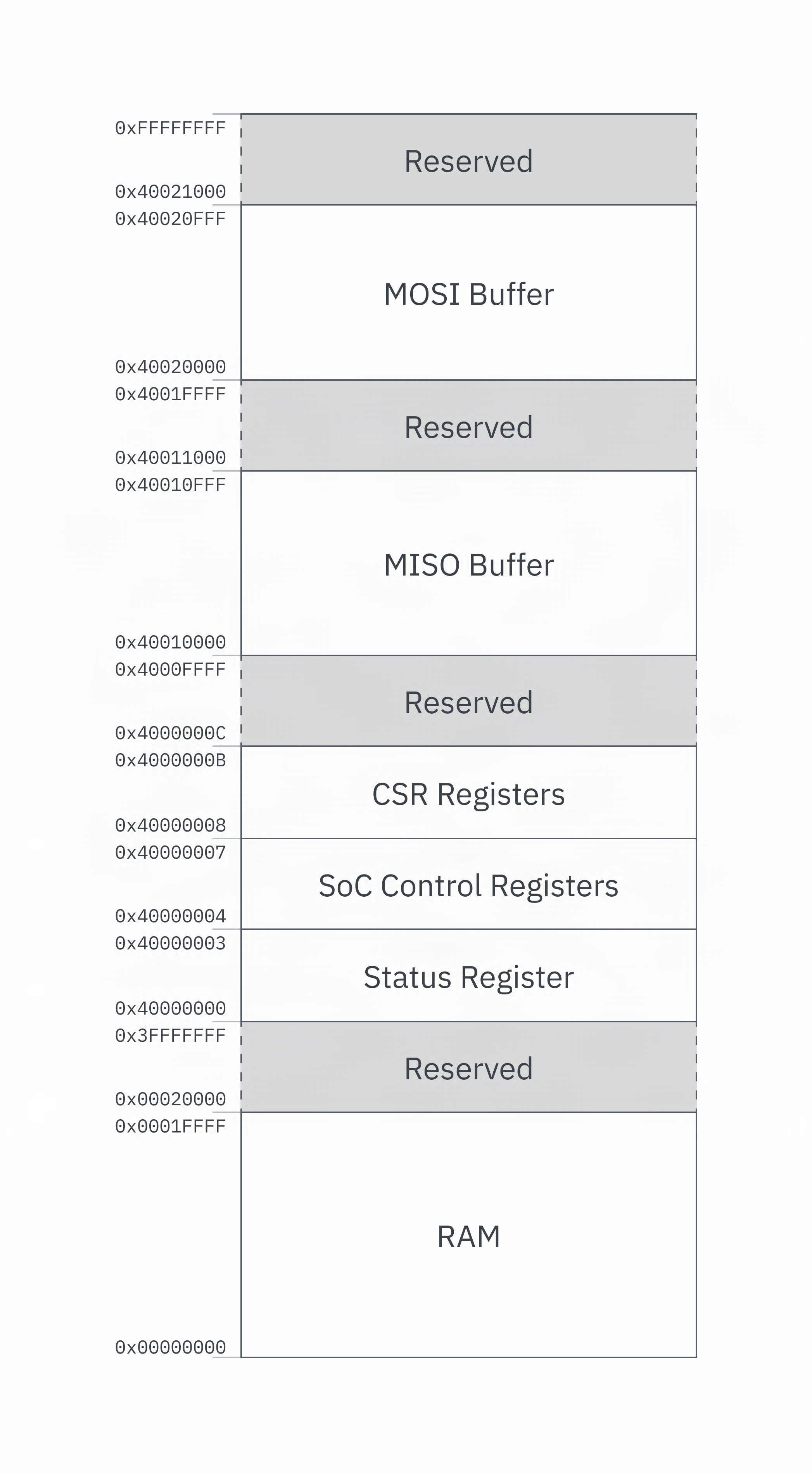 The Signaloid SoC features 128KiB of internal memory (SPRAM) which is dedicated for the user application. Upon system reset, the SoC initializes itself by copying the first 128KiB of data that are stored in the user data sector of the onboard non-volatile flash (see USER_DATA_OFFSET sector of the bootloader addressing section), before starting its execution from address 0x00. Following is a detailed diagram of the memory map of the SoC: